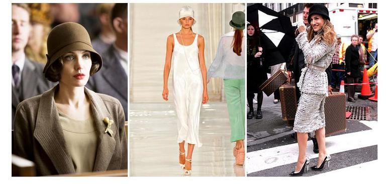 Шляпка называется клош (Анжелина Джоли в фильме "Подмена" носила такую). Можете в интернете самостоятельно поискать еще примеры.