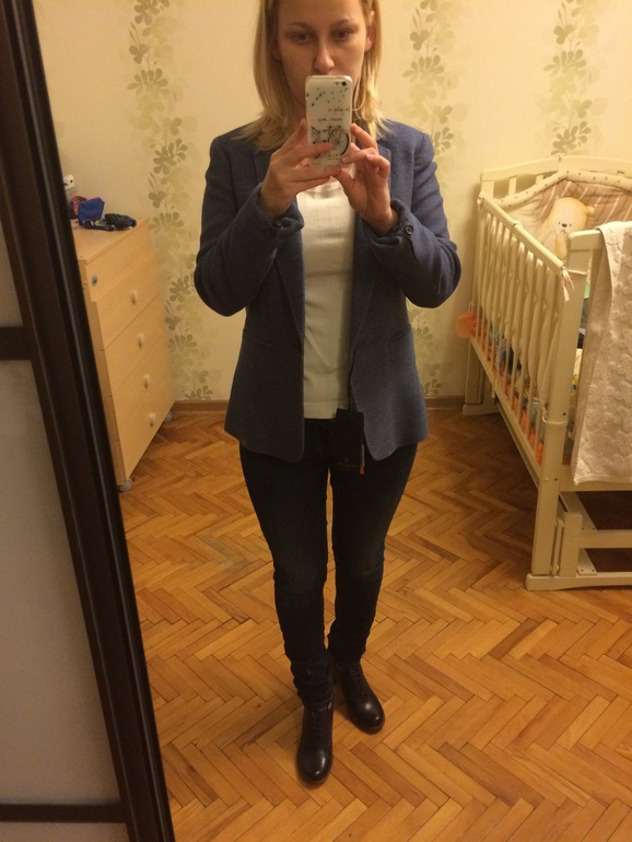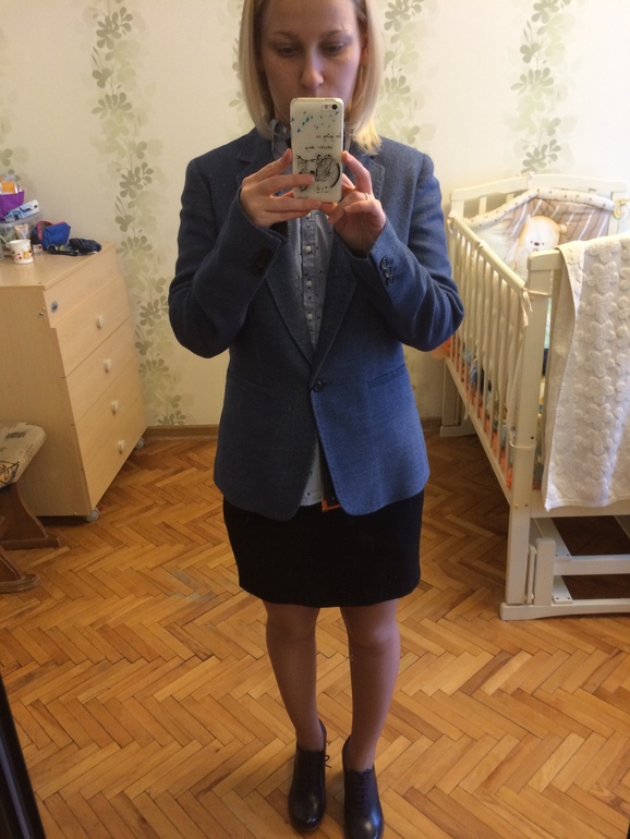 Дресс код не очень строгий. Просто самой хотелось уйти от джинс. Три года в них хожу))). Спасибо за совет про пиджак. Завтра пойду рукава перешивать отдам и пуговицу. Он ещё с платьями плотными хорошо смотрится