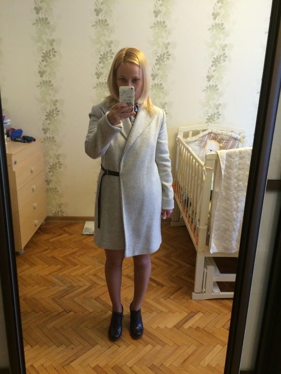 Может колготы черные плотные сюда, а то ботиночки ноги режут. Пальто какое-то странное...или его не застегивать или просто ремешок по кругу. Блузку тоже надо бы заправить.
