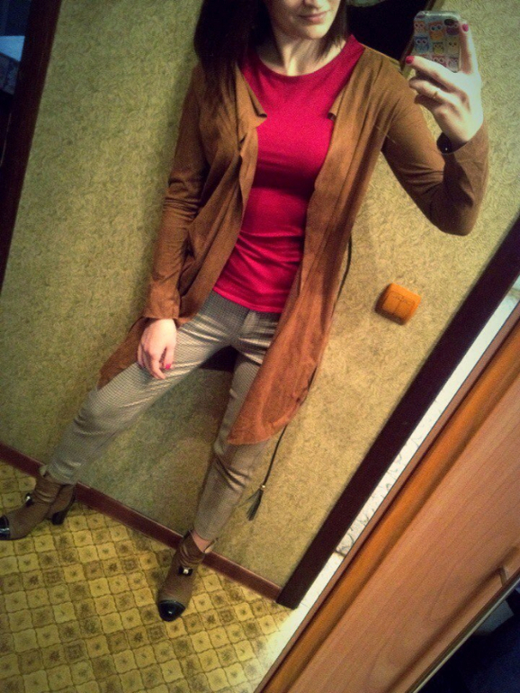 Еще там же, в Модисе, взяла кардиган под замшу. Очень красивый цвет) Но мне не очень нравится длина. Может, его немного обрезать?