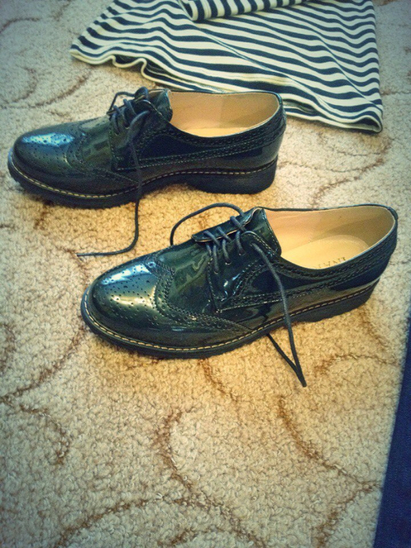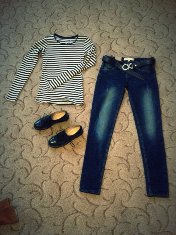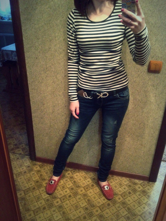 Купила тельняшечку, какую и хотела. Это Ашэндэм. Джинсы - Коллинз, а ботиночки взяла в Инарио