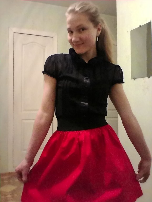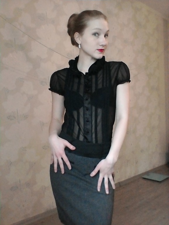 Из всего мне не нравится помада))). Все остальное требует других компаньонов. Первая блузка темно синей юбки карандаша с приличным разрезом позади , шпилек и прически со второго фото. Вторая блузка пиджака и ...вот даже не знаю что вниз, но ни эту ,ни красную юбку точно. Третий комплект- повседневка, с другой помадой будет дружить.
