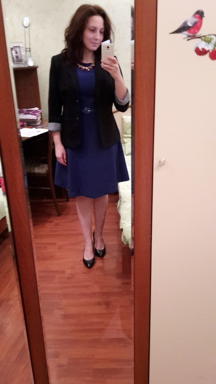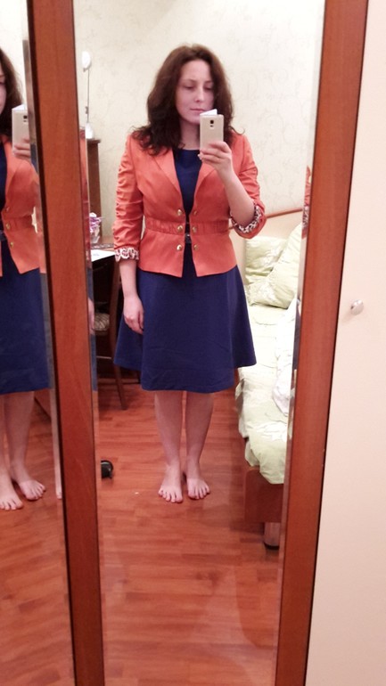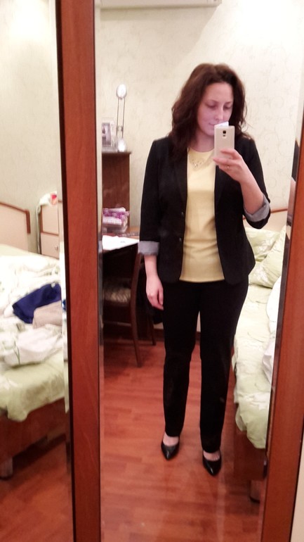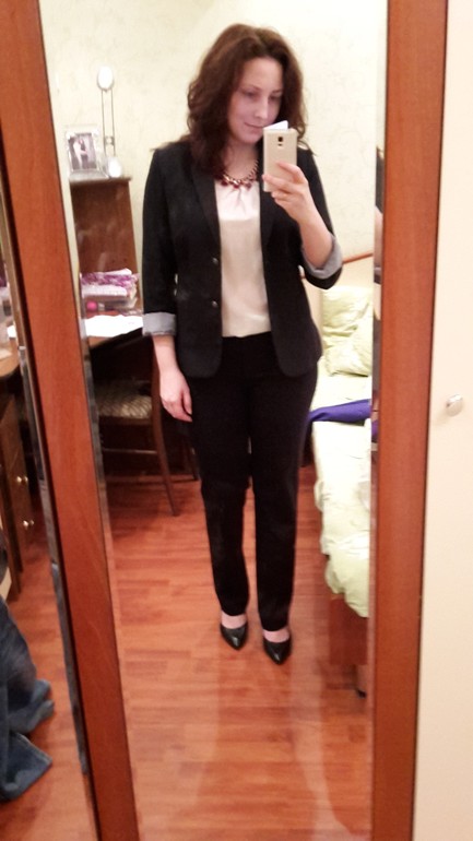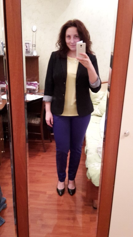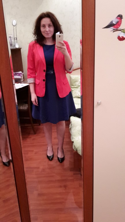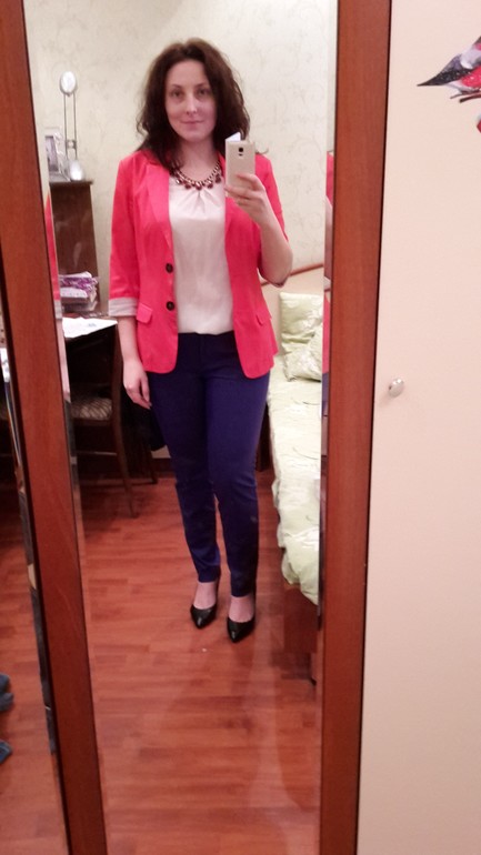 Платье все же лучше с утяжкой. Красота требует жертв, увы и ах) Может нюанс фото, но синие брюки я вижу фиолетовыми. Понравилось с розовым пиджаком, а вот черный лучше с черными брюками.