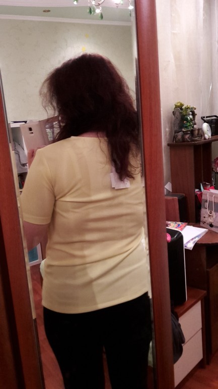 Желтая кофта по мне великовата. Натягиваешь нормально, а посидишь, походишь, она поднимается и очень много сборак на животе и спине. Меньше мерила размер, мне показалось, что в облипку очень ((