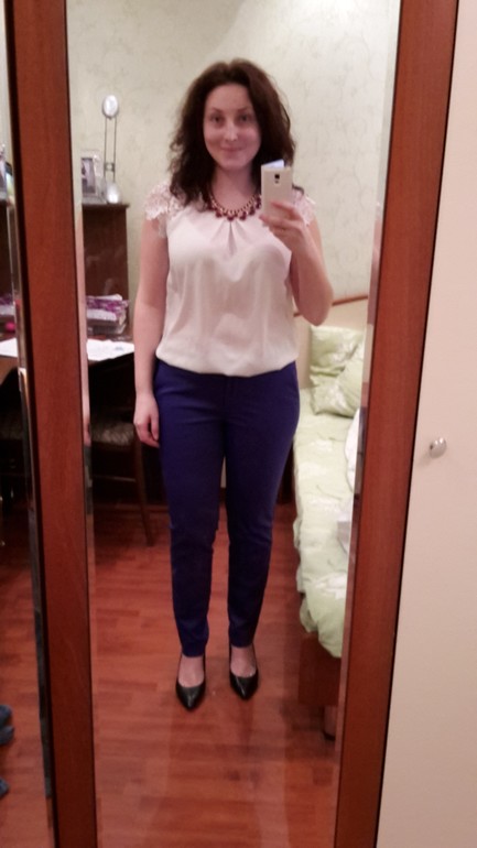 вот поменьше размер, но если одену брюки, будет видно мой округлый живот, а если синии одену живот будет очень сильно т.к немного вываливается ( Вот не знаю менять на размер поменьше все-таки или сдать.