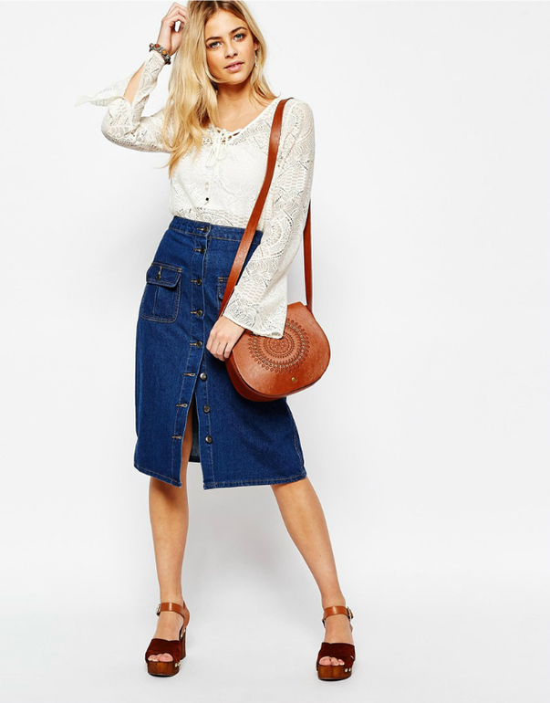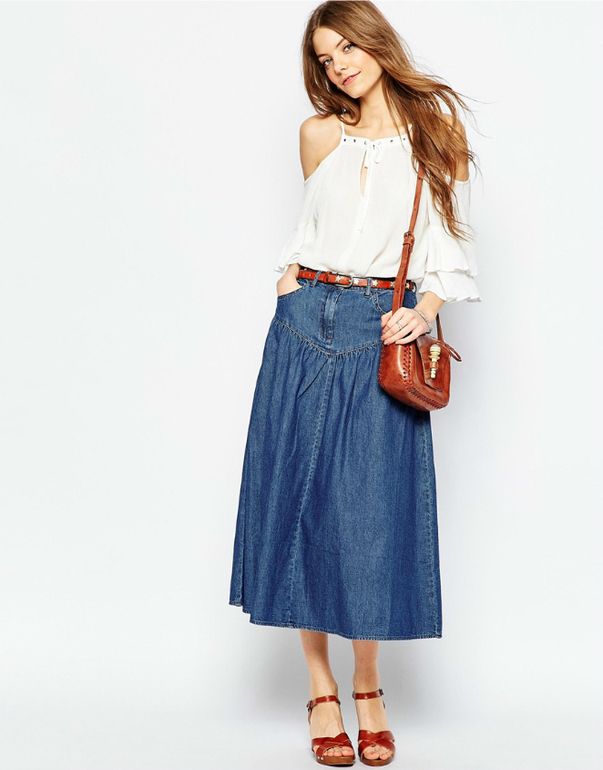 ОдеждаВсе чаще вижу в ретро-луках джинсовые юбки миди.