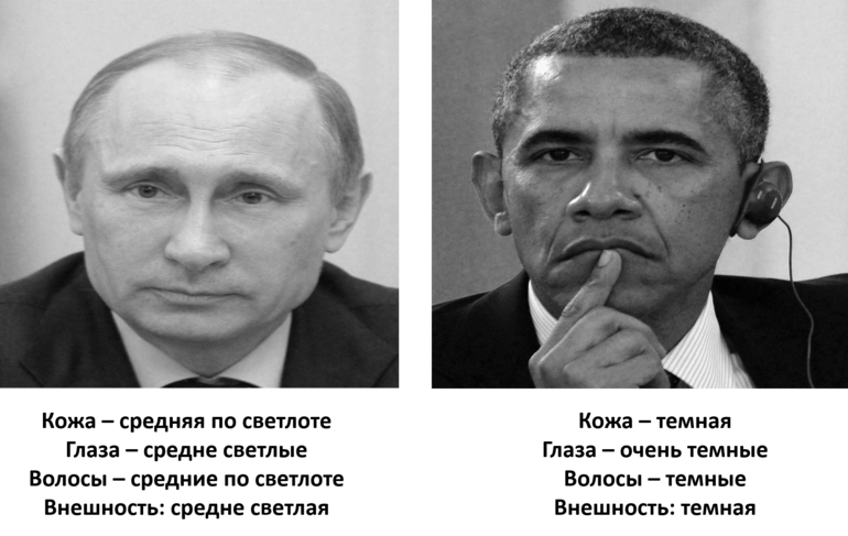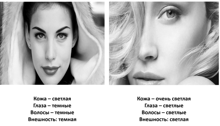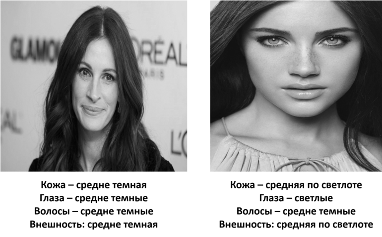 Естественно не всегда кожа, глаза, волосы будут одинаково светлыми или средне светлыми и т.д. Проанализировав кожу, глаза, волосы нужно отнести себя в итоге к более темной внешности средней или к более светлой. Примеры)