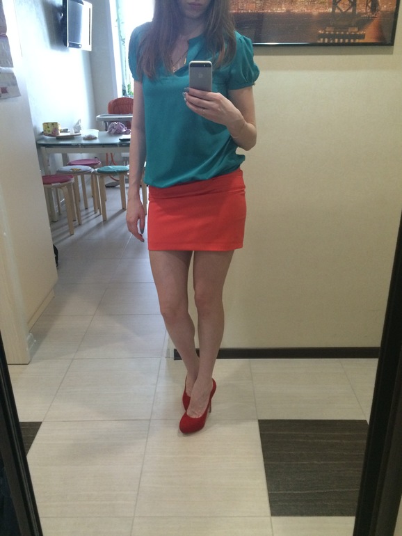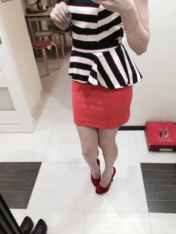 Первая кофта просвечивает немного, синяя просто не нравится, простите, а последняя с баской может на выход. И туфли такие точно не дружат с этой юбкой 🙄