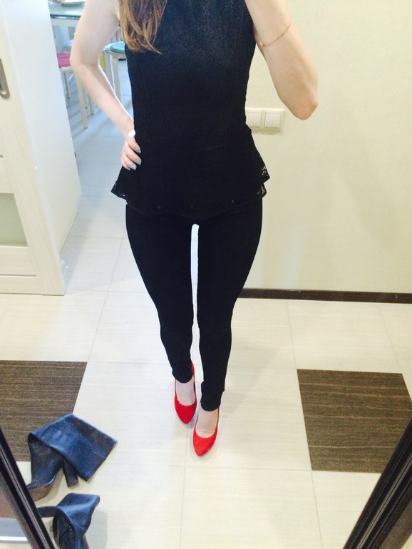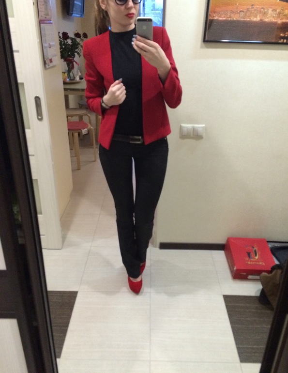 Мне нравится очень с красным жакетом и с топом с баской! Здорово, что и туфельки, серьги есть:)