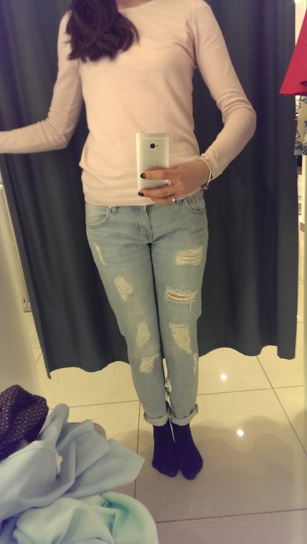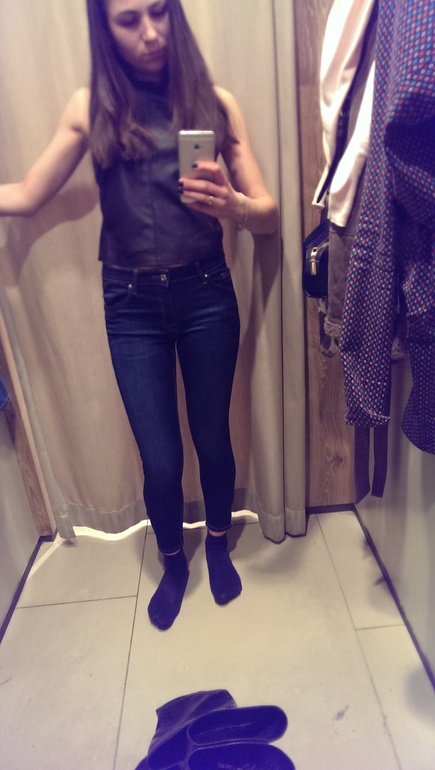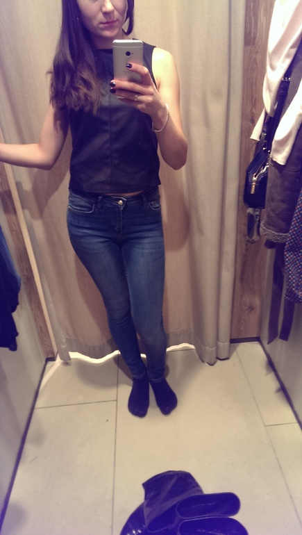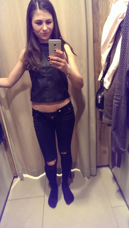 Нежно-розовая кофточка обычнейшая из золлы Натуральный состав я б за, обращаю на него внимание, а массимо у нас нет. Джинсы последние оджи, мне как-то неудобно, хочу посадку выше, а так сидят под животиком. Топ кожзам куда его и в какой сезон... Весной наверное только, летом жарко будет. А куда носить это точно найду)) но у меня к нему ничего грубого и брутального нет, ботинки и косуха только. Люция, за ножки спасибо!)