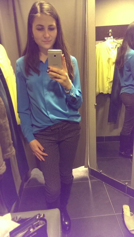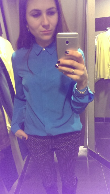 блузка зарина с красивой верхней пуговичкой, цвет сине-голубой. Но что делать с полиэстером, электризоваться будет?