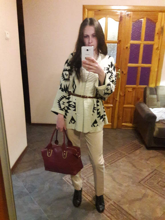 штаны и сверху кофта по цветам не сочетаются. в кофте черные и белые оттенки, брюки было бы лучше серые или черные, но не бежевые. хотя сидит все прекрасно