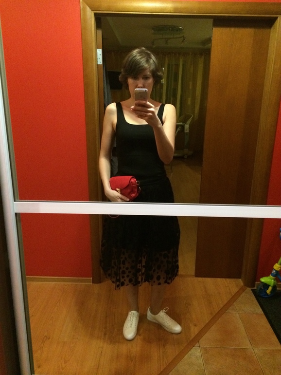 Попробуйте вашу черную юбку одеть с каблуками - лодочки черные или нюд , а наверх , надо поподбирать . Вожножно сто даже рубашка неплохо будет надо мерить все подряд :) просто она такая с заявкой на то, что нарядная .с кедами - вообще нет .пачка эта - не ваша . Мне так и хочется вас увидеть в комтюме брючном с дудочками и коротким пиджаком . Вот это воотще мне кажется Ваше!
