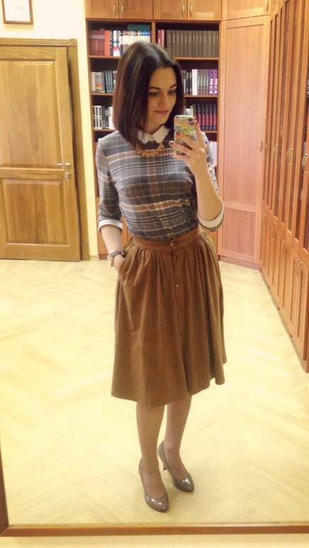 Очки идут. Где волосы собраны, вообще супер. Еще красную помаду и шик, я так и вижу Вас в таком образе, еще черное платье и с воротничком как у блузы.