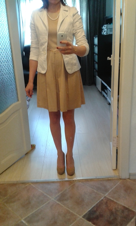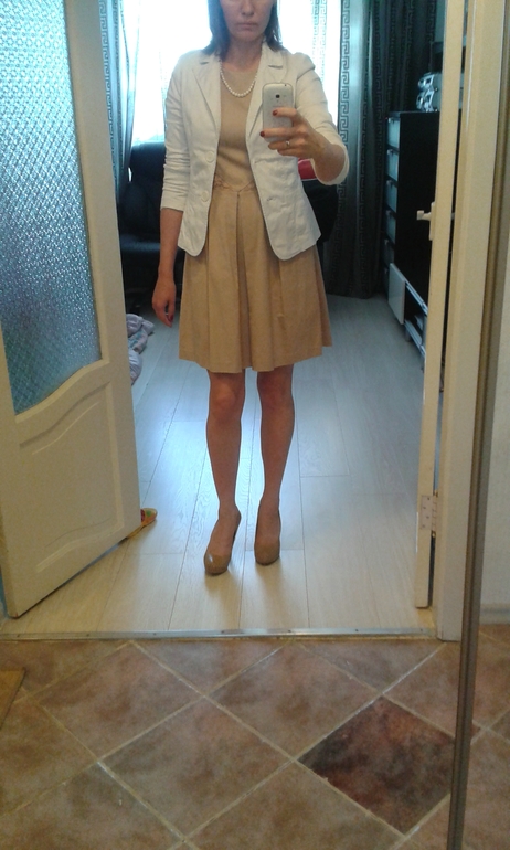 Норм, но не ах!), мне кажется вам цвет поярче нужен, с этим сливаетесь. В груди не критично, мне кажется линия талии чуть выше, чем надо). С пиджаком больше нравится, для такой модели лучше бы цвет поярче или хотя бы аксы или обувь), да и пиджак поярче. Если оно бежевое, то лучше красный-бордовый, коричневый, возможно зеленый благородный цвет, либо бирюза, либо золотой, но благородный цвет, жемчуг мне кажется тут вас старит, ноги у вас отличные, носите такую длину!