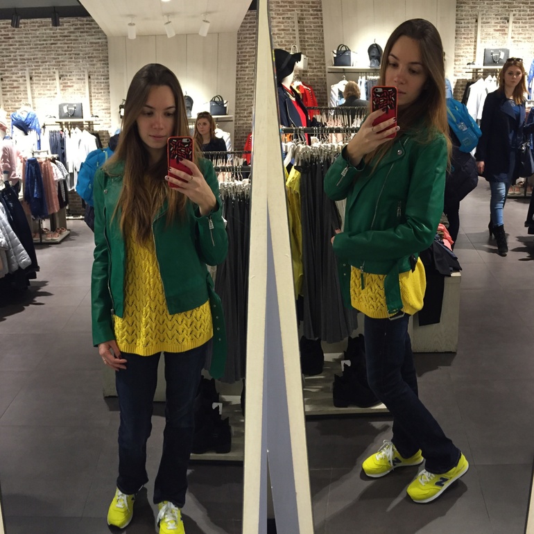 (Яркости прибавила). В общем не советую. Дальше я примерила кожанку, которую нашла Катерина в страдивариусе, там есть розовая, белая, голубая, рыжая. Не знаю, не уверена я что-то в ней...