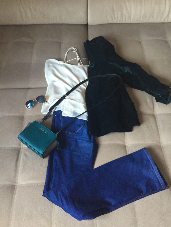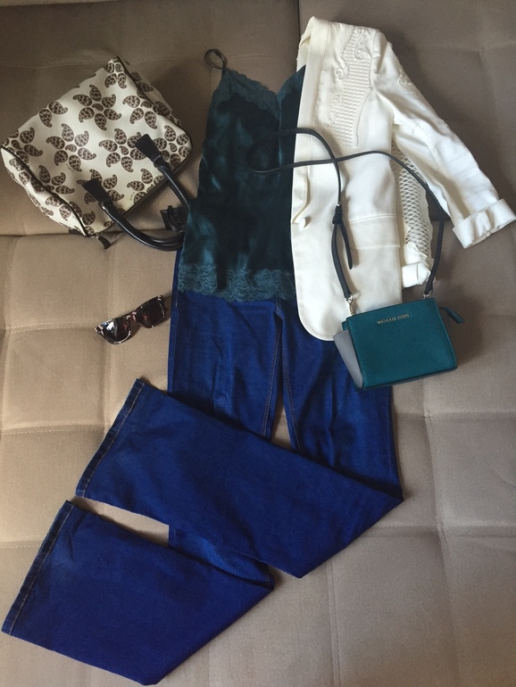 Еще один образ с жакетом. Жакет-смокинг H&M, майка intimissimi, белая сумка Furla, зеленая сумка Michael Kors, очки Valentino.
