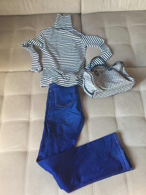 Первый образ с водолазкой. Простенький, но на мой взгляд достаточно яркий из-за полоски. И стильный. Вообще, эту водолазку ношу и в хвост, и в гриву, как говорится. Действительно такая универсальная вещь оказалась! Джинсы Zara, водолазка Zara, сумка LV. Из обуви у меня сюда идут черные ботинки на каблуке.