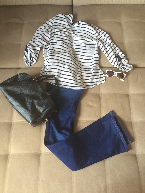 Продолжая тему полоски, я достала из шкафа свою многолетнюю блузку. Вообще, клёш мне навевает тему моря, морской формы у моряков. С обувью не ясно пока, т.к. это будет вариант на весну теплую, скорее всего туфли на каблуке. Кофта zara, сумка etro, очки no name.
