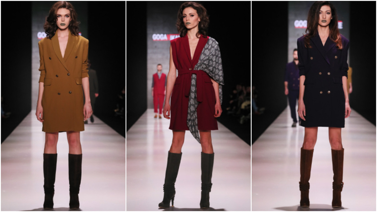 Начало модного шоу было крайне романтичным: под лиричную мелодию появились двое, Он и Она. Пронзительные взгляды, магнетизм и блеск в глазах, но тут, уверенной походкой, Она уходит, а Он долго смотрит ей вслед. Алый, розовый, фуксия - оттенки страсти открывают модный показ. Модели начинают свой танец на подиуме, раскрывая перелив металлического отблеска на уютных кардиганах, одетых поверх ярких платьев. Каждый женский образ дополняют высокие сапоги из цветной замши, выполненные в стиле Никабадзе, которые из сезона в сезон приобретают новые очертания не теряя своей основной идеи.