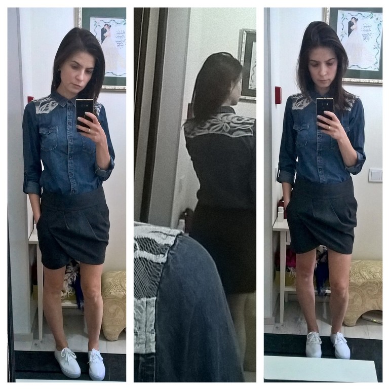 1. есть такая юбка - из темно-серой ткани с карманами. попробовала с имеющейся джинсовой рубашкой (модно же сейчас