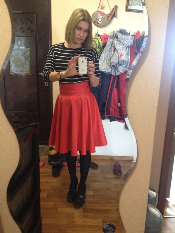 Если с высоким поясом, то однотонную кофту. Белую блузку или руьашку я бы надела. А если с этой тельняшкой, то пояс узким лучше сделать