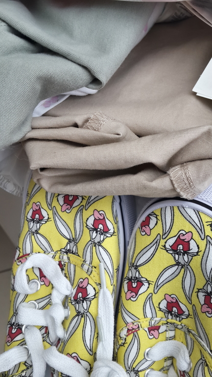 Футболку или даже майку...белую с рисунком,или жёлтую...Вообще можно с разным цветом эксперементировать.Мне кажется цвет этой футболки придаёт такой ткани не оч приятные впечатления)🤗Этот цвет Вам как холодный что ли...Вам однозначно поярче надо!