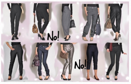 модель немного зауженная к низу или прямая от колена / длиной чуть ниже лодыжки / брюки не должны быть с низкой посадкой (такая модель укорачивает ноги) / однотонные / хорошего качества / ткань должна быть в меру плотной, чтобы держала форму / с добавлением эластичной нити для комфортного ношения / без гладких матовых тканей, без блеска и ворса (которые увеличивают объемы)