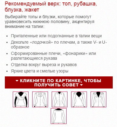 Для данного типа женской фигуры необходимо расставить акценты таким образом, чтобы первое, что привлекало внимание - были голова и линия декольте.
