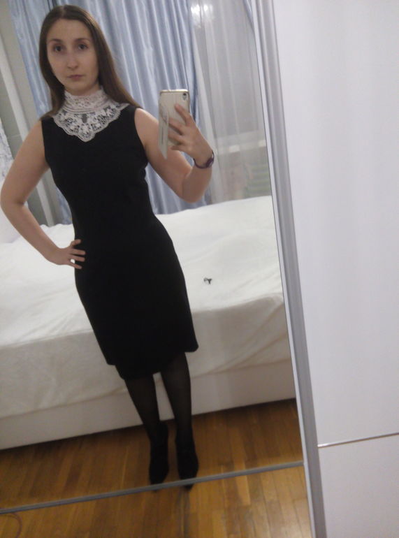 мне оба не нравятся. первое повседневное и мне кажется чуть велико вам. а во втором вы на монашку похожи,из-за ворота. вам бы вырез поинтереснее