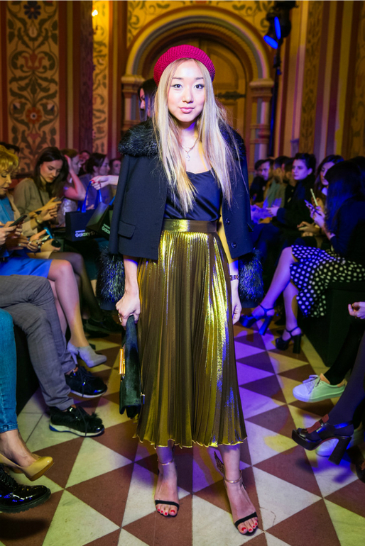Золотая юбка выглядит замечательно ,но вот конкретно в образе и на этой девушке выглядит а-ля продавщица огурцов с рынка ,парадокс ,а вот юбка вне девушки нравится
