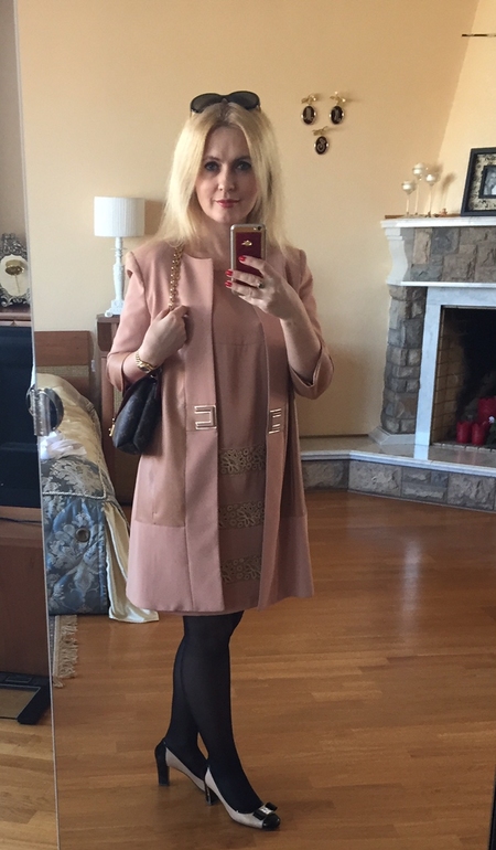 Вы уж простите, но не нравится ваш вид. Одежда для женщин за 50. Цвет вам этот не идёт. Полоски на платье режут ваш низ. Золотые пряжки на пиджаке- пальто совсем не в кассу. Чёрное колготки сюда не подходят, как и эти туфли. Все из разных опер. И очки так не носите...