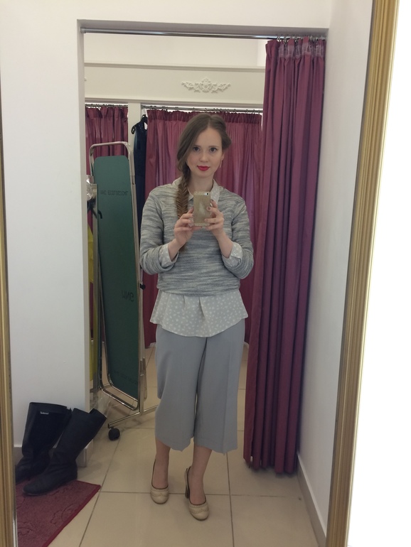 Единственный образ, в котором так горячо обсуждаемые и осуждаемые кюлоты мне нравятся) И серый цвет Вам очень идет! Вот туфли лучше заменить, да Вы и сами так думаете) Не обязательно высокий каблук и сильно острый мыс.