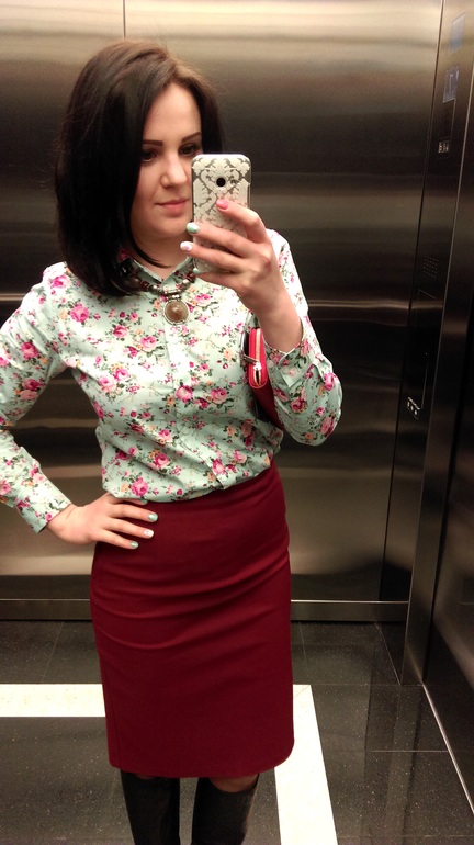 Блузка очень качественная, хлопковая, заказывала на повседневку к многочисленным юбкам. На работу надела с бордовой и только в лифте поняла, что украшение на шею совершенно не подходит, нужно что-то более лаконичное и темное. Ну, смотрите: