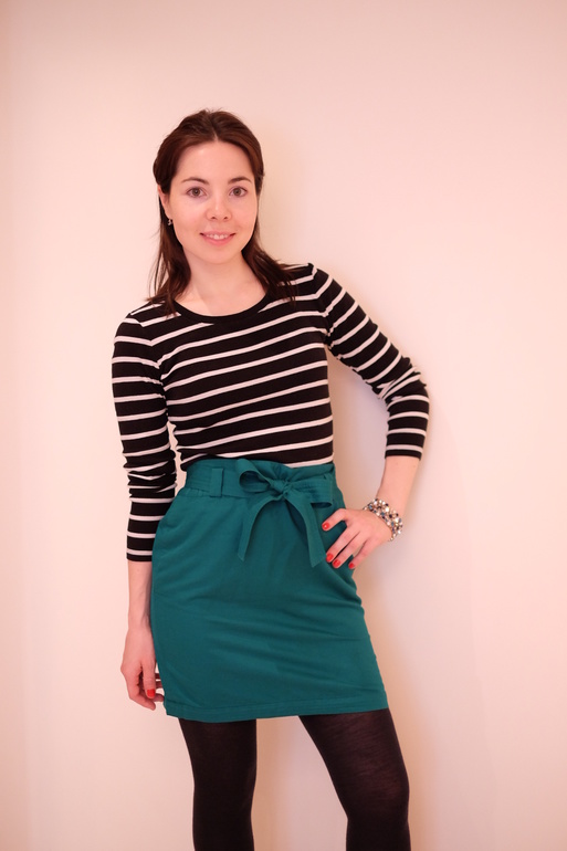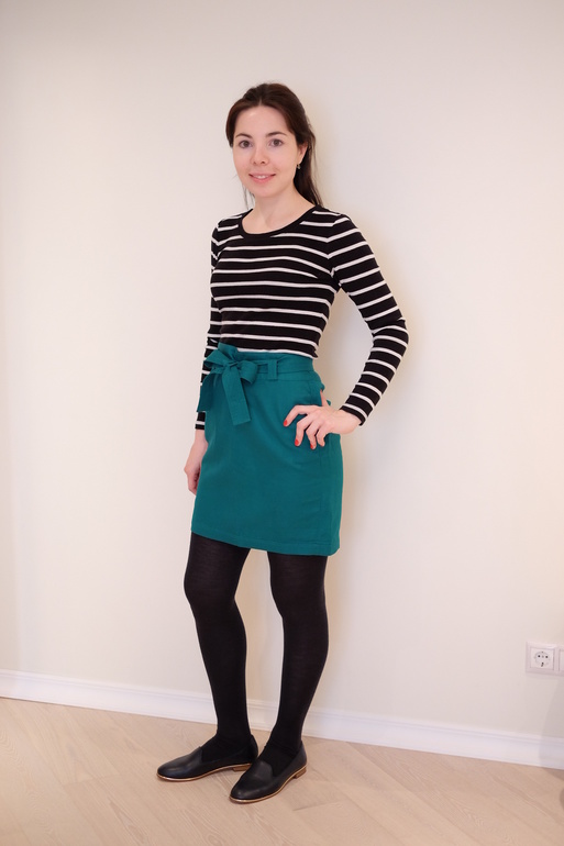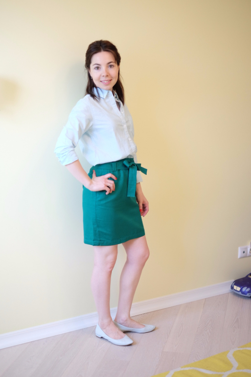 Первая универсальная вещь, - это зеленая юбка, которая отлично вписывается в разные стили. Мы примеряли с рубашками, и тогда это получался сдержанный и уместный образ в офис. Заменяли на тельняшку, тогда более свободного плана и менее строгий образ на каждый день. Также можно поиграться с ремнем, заменив родной ремень на кожаный классический. Данная юбка с рубашкой: