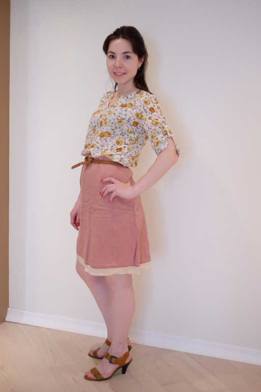 Я почему-то не смогла определиться с симпатиями к предпоследнему образу, где юбка и блузка в цветочек) С блузкой все понятно, а что за крой у льняной юбки?