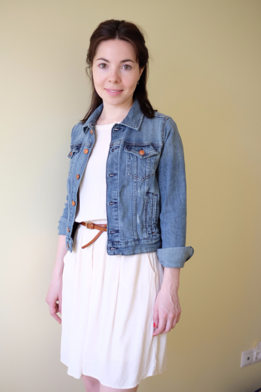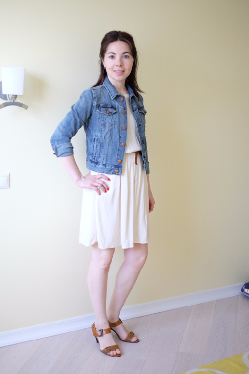 А теперь образ, который хотелось бы обсудить, потому что планирую использовать его на фотосессию. Платье легкого молочного цвета вкупе с джинсовой курткой. Екатерина не была в восторге от него, рекомендовала носить джинсовую куртку со свободного кроя платьями, но за неимением этих, примерили с тем, что было. Честно признаюсь, мне этот образ очень нравится, я чувствую себя в "своей тарелке", это мне очень близко и комфортно: