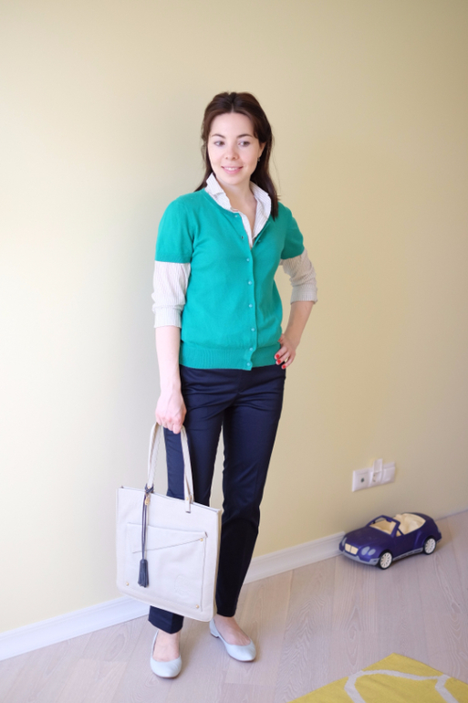 Недавно приобрела брюки темно-синего цвета с отличной посадкой, мы примерили достаточно необычный образ:поверх рубашки с длинным рукавом мы надели кардиган с коротким. Екатерина советовала носить его растегнутым в паре с топом из подобной ткани как и сам кардиган. Или носить только кардиган отдельно от рубашки в паре с объемной юбкой с поясом.