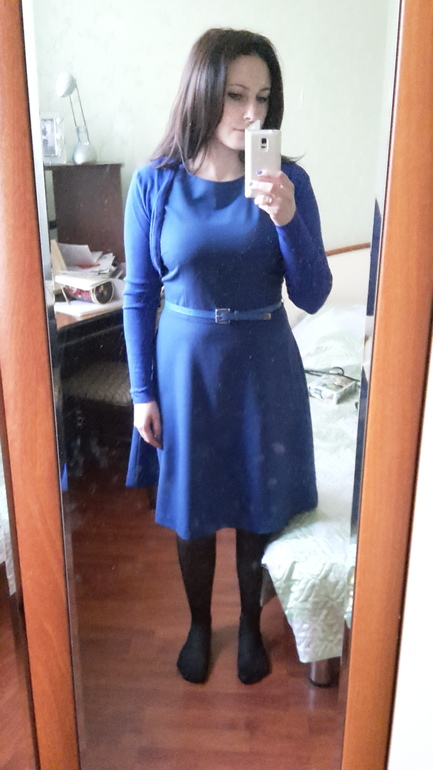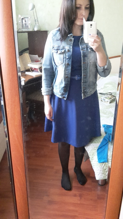 Мне кажется ремень на платье не нужен или джинсовка покороче должна быть.