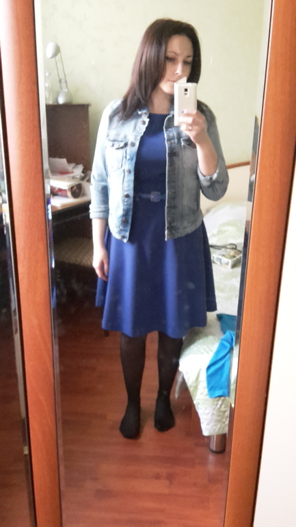 Если джинсовку смените на укороченную, максимум до уровня ремня на платье и чулки на телесные, а ремень контрастным с платьем выберите, то может и вполне ничего получится:)
