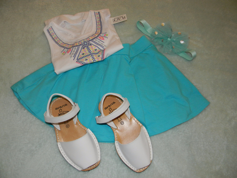 Еще вот такой комплект собрала, повязка Чилдрен Плэйс вроде, еще в феврале покупала. Майка и юбка-шорты тоже Чилдрен плэйс. Вот потянуло меня на мятные, голубые расцветки.