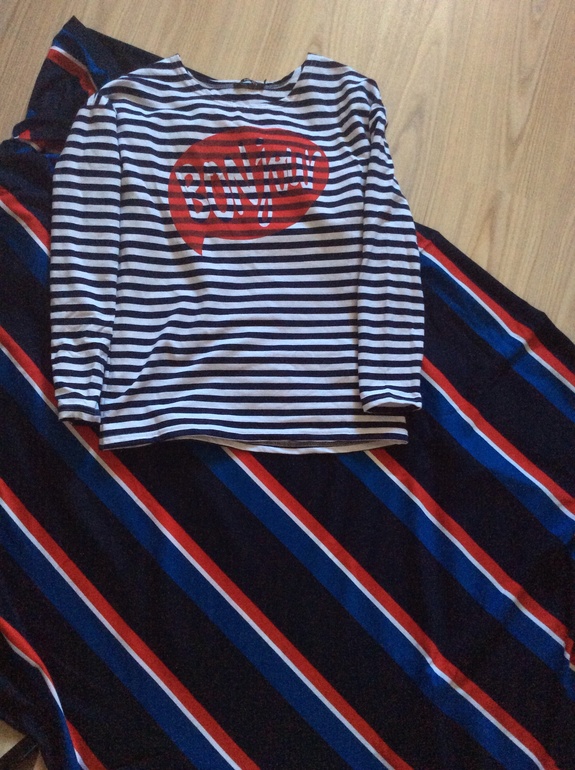И вот в чем вопрос: есть у меня отрез трикотажа в темно-сине-красно-белую полоску