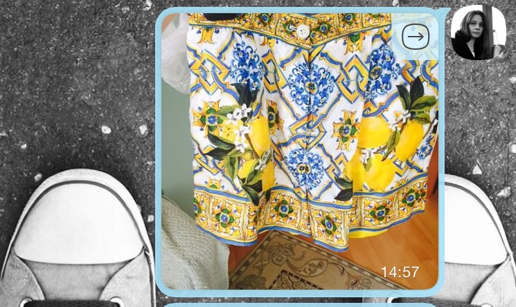 Для прогулки по городу почему бы не рассмотреть вариант верха в тех же цветах, но с другим орнаментом, например в горох, полоску (сине белую или черно белую)? Найти вряд ли получится, но можно самой, на досуге, расписать обычную футболку из ТВОЕ. Сейчас даже в одном изделии сочетают разные рисунки. Не совсем пэчворк, но близко. А сверху в прохладную погоду можно накинуть жакет классический черный или белый с засученными рукавами.