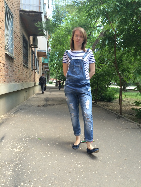 А мне нравится. Лежит у меня тоже комбез джинсовый. Только штаны не драные. Я бы еще побольше завернула штаны и на более широкую полоску. И тут скорее кеды подойдут.