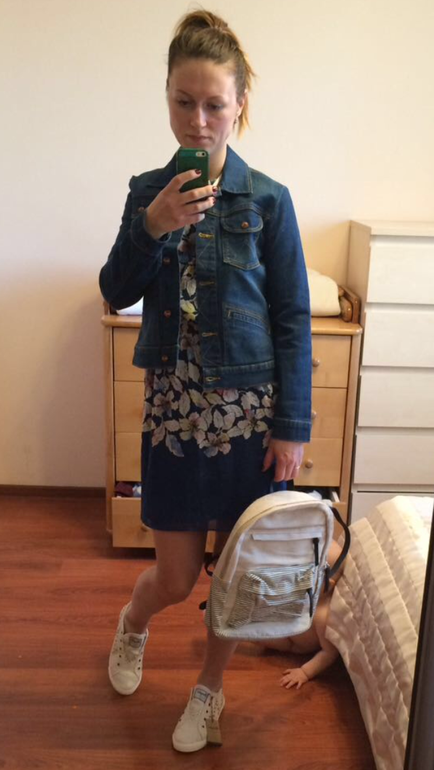 Мне не нравится джинсовка - она Вас не украшает и не сочетается с джинсами. Я бы может более короткую посмотрела. И кеды в сочетании с платьем - зачем? Туфель нет? Кеды со спортивным платьем сочетаться будут (хотя, мода сейчас странная, но не всегда это красиво и женственно).