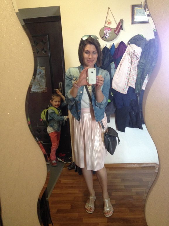 На прогулкеДолгое время была уверенна,что юбка так и останется лежать в шкафу. В очередной раз достала ее, покрутила, отнесла портнихи укоротить, и ношу теперь с удовольствием. Осталось только светлую сумочку купить)