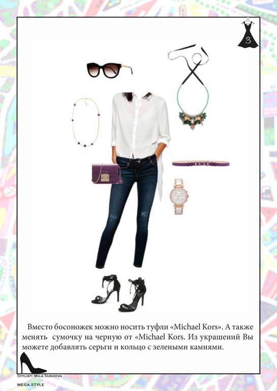 Вещи, которые нужно было вписать в комплекты: сумка Furla, кросс-боди Michael Kors, туфли черные Michael Kors, часы и украшения.