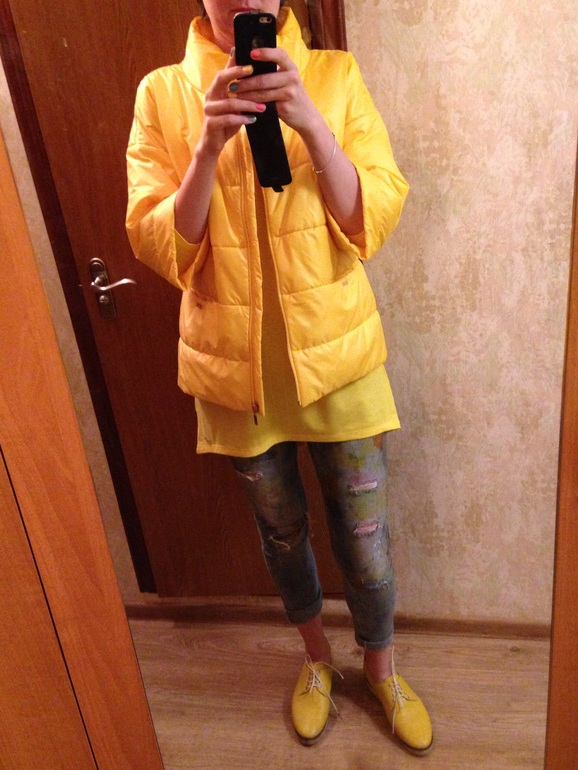 В идеале, жёлтая потертая косуха... Но, возможно, джинсовая куртка или жилет, жёлтая майка или жёлтый джемпер оверсайз. Это один вариант. Классика жанра, так сказать... А, если делать контрастный look, тогда белая рубашка мужского кроя, навыпуск, заправленная только впереди, жёлтый аксессуар(один) любой на выбор, либо серьги-гроздья, либо браслет, и какой-нибудь женственный кардиган желтых оттенков.... Но, все надо смотреть. Ботинки желтые разными бывают...