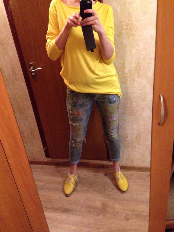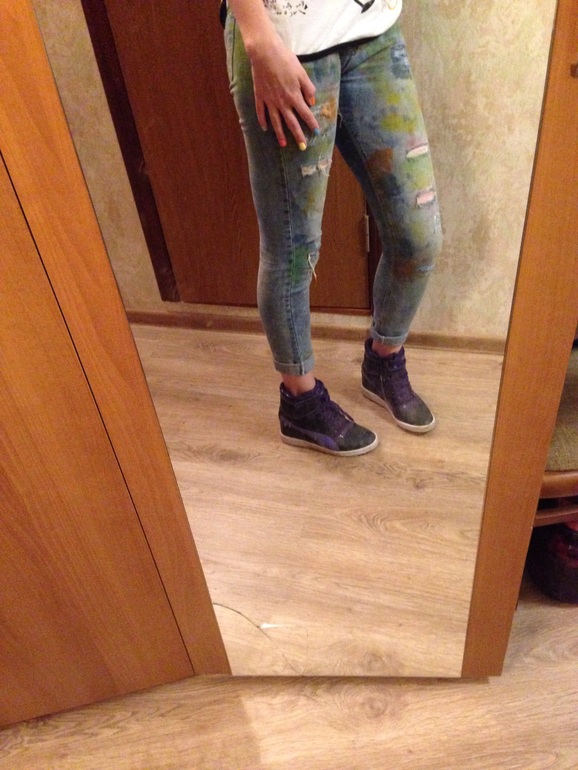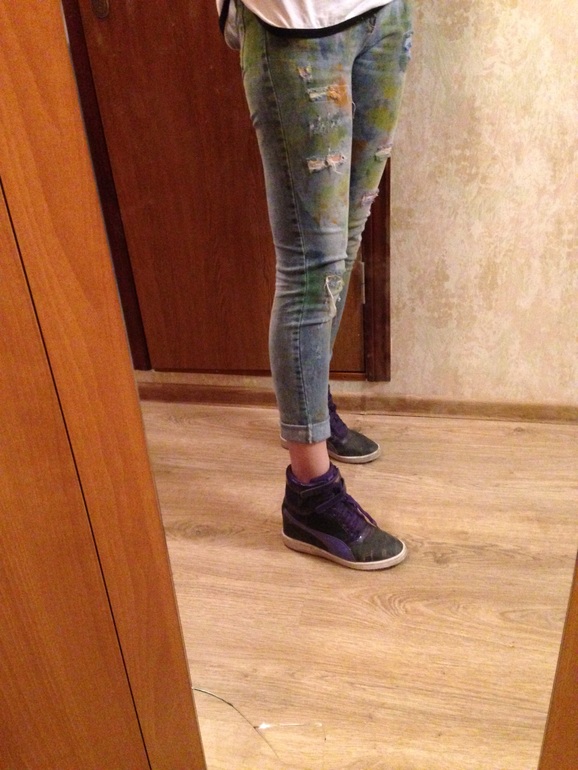 Простите, но может стоит поискать замену джинсам? Не знаю почему, может фото так отражает свет, но ощущение, что в них рисовали и замазали краской.
