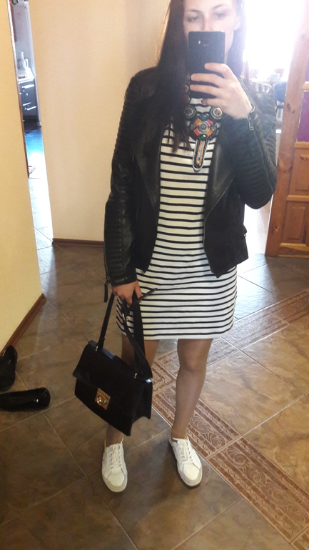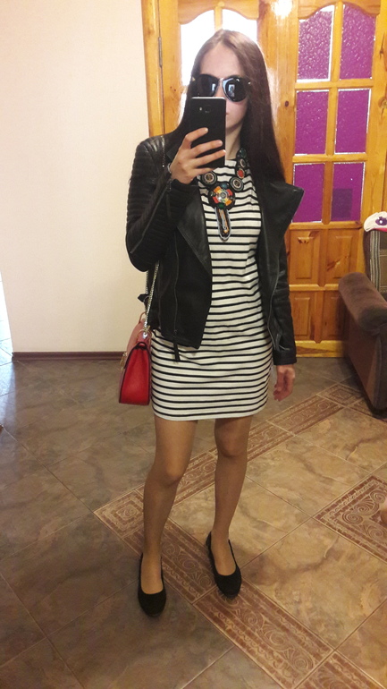 Ожерелье из другой истории! Сумочка из третьей. Если снять ожерелье и упростить сумку, то, все просто идеально! Полоска не любит соперничества. Если только, Ваша бижа не из морской тематики! Замечательный образ, прекрасная фигура. А ноги!!!
